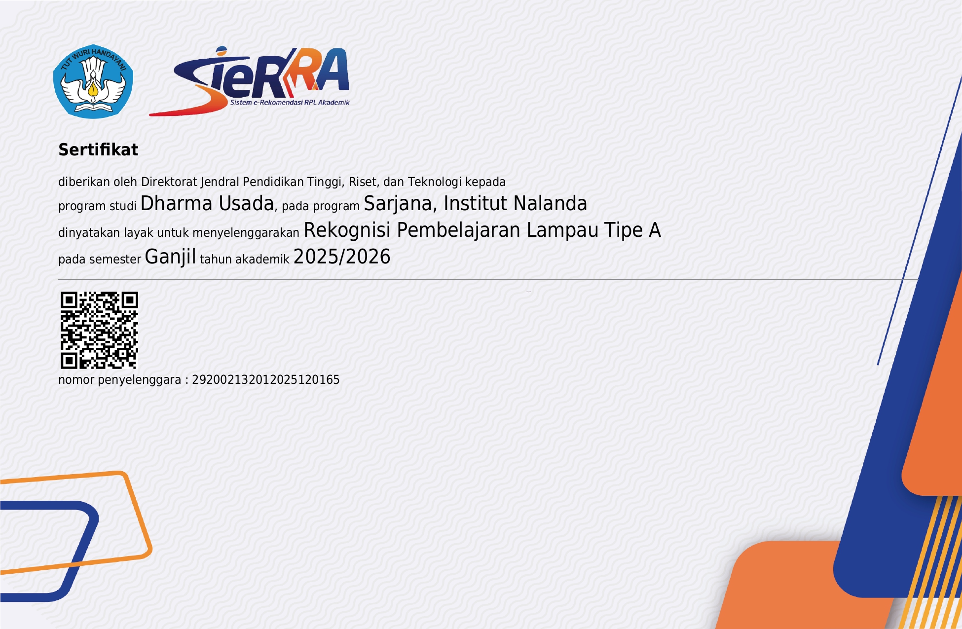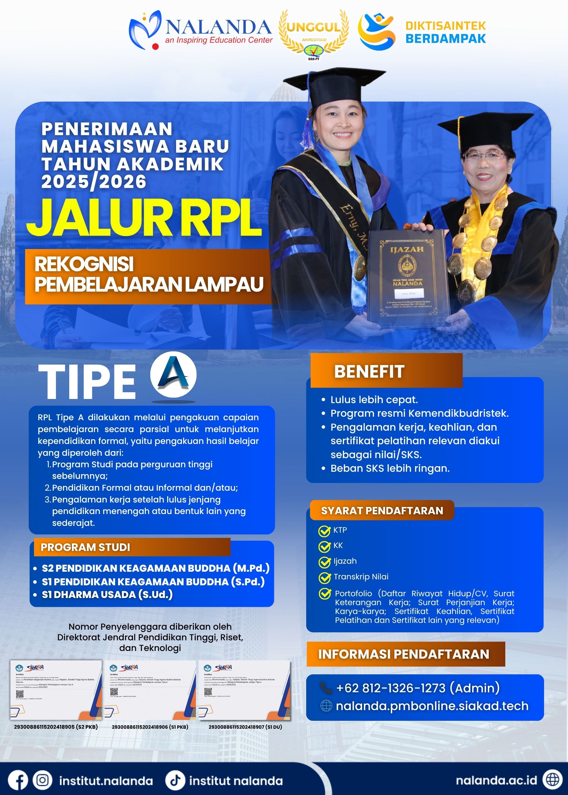 Institut Nalanda, mengacu pada Permendikbudristek Nomor 41 Tahun 2021 tentang Rekognisi Pembelajaran Lampau (RPL), memandang penting untuk memberikan kesempatan sebesar-besarnya kepada masyarakat untuk terlibat dalam pendidikan sepanjang hayat. Melalui RPL, kami bertujuan untuk memberikan akses kepada individu untuk melanjutkan pendidikan formal ke tingkat yang lebih tinggi, yang pada akhirnya akan menghasilkan pengakuan berupa Ijazah.